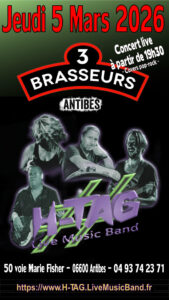 H-TAG @ Les 3 Brasseurs – Antibes Événement exceptionnel à Antibes ! Jeudi 5 Mars 2026 Le groupe H-TAG Live Music Band posera ses amplis aux 3 Brasseurs à Antibes pour un concert de folie Réservations conseillées : 04 92 98 16 17